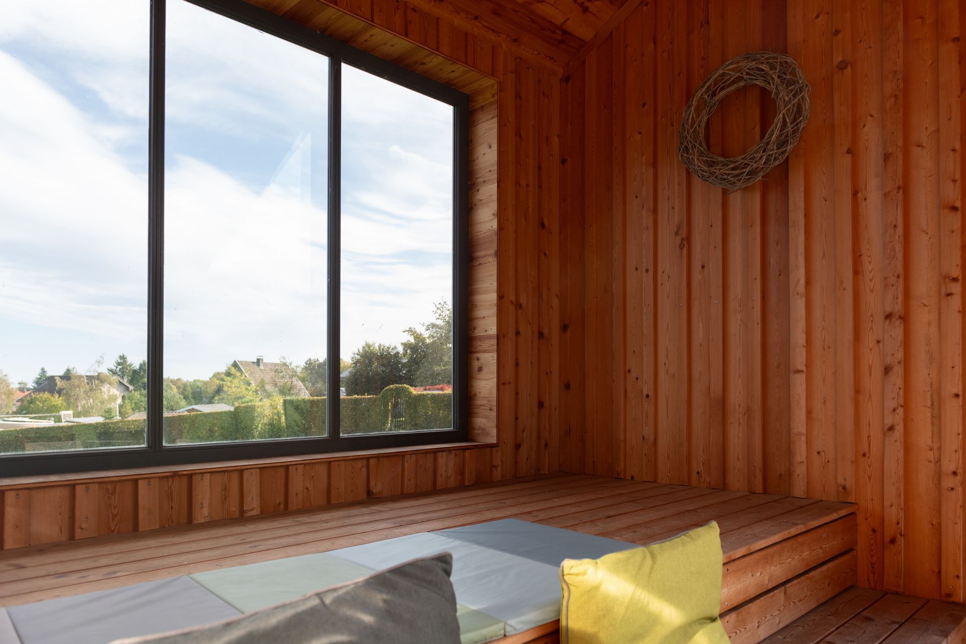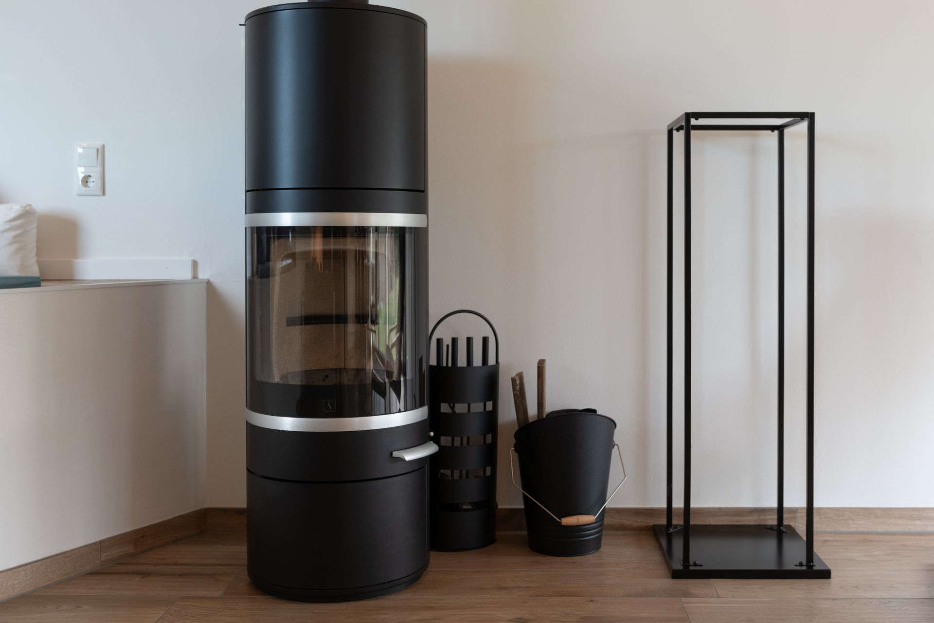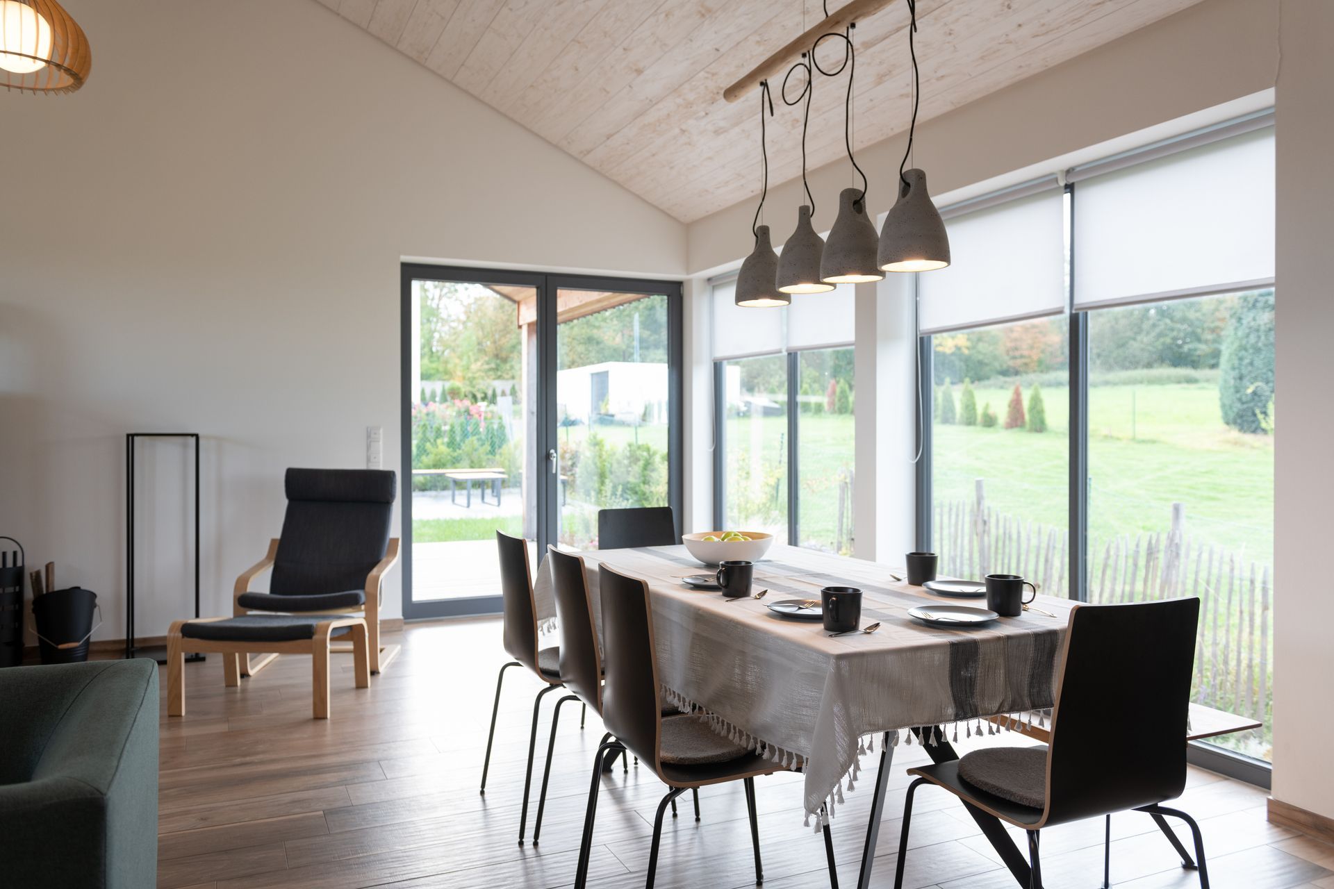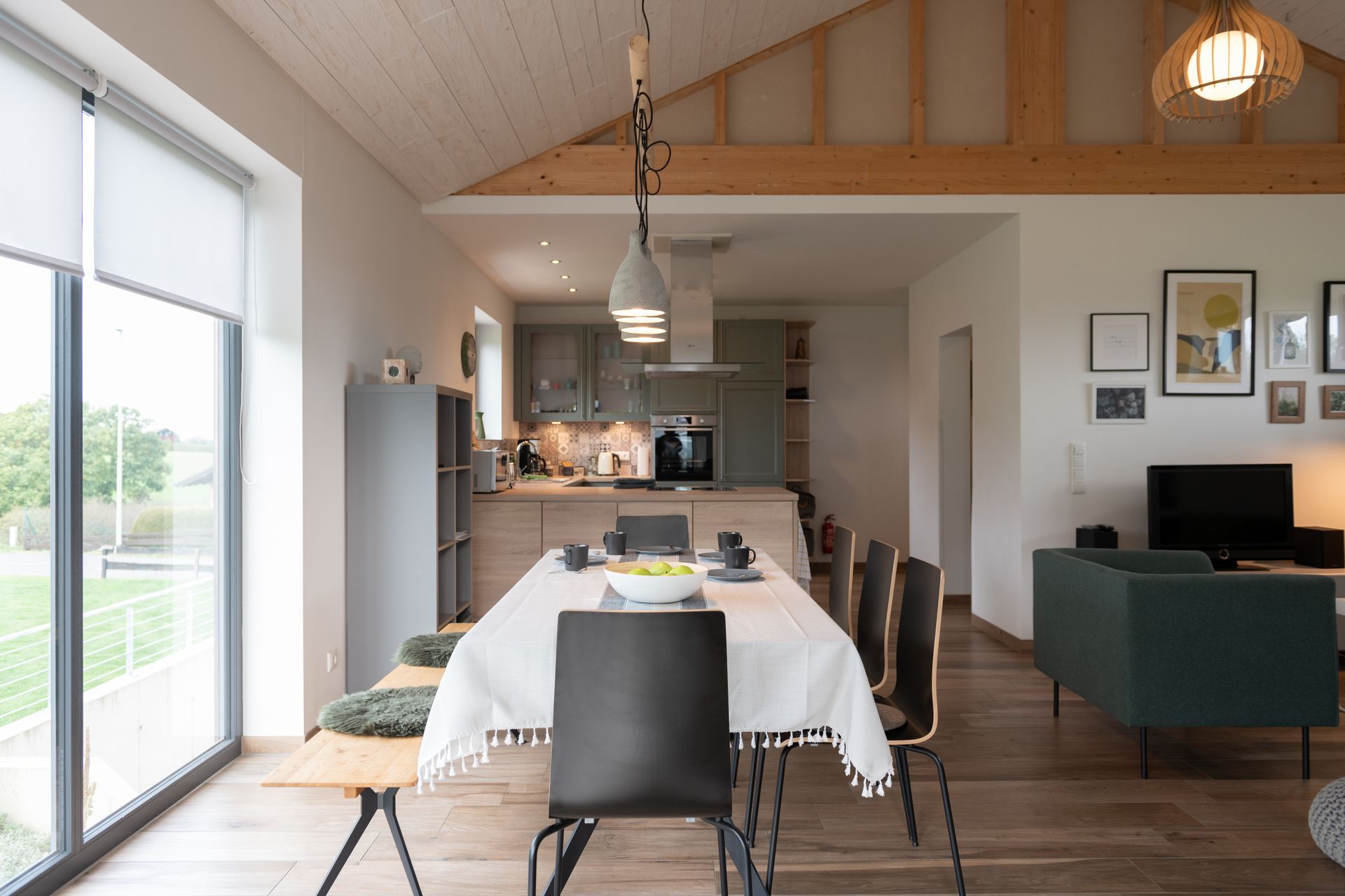 Großzügiger Wohn-Essbereich mit Kaminofen und Sitzfenster