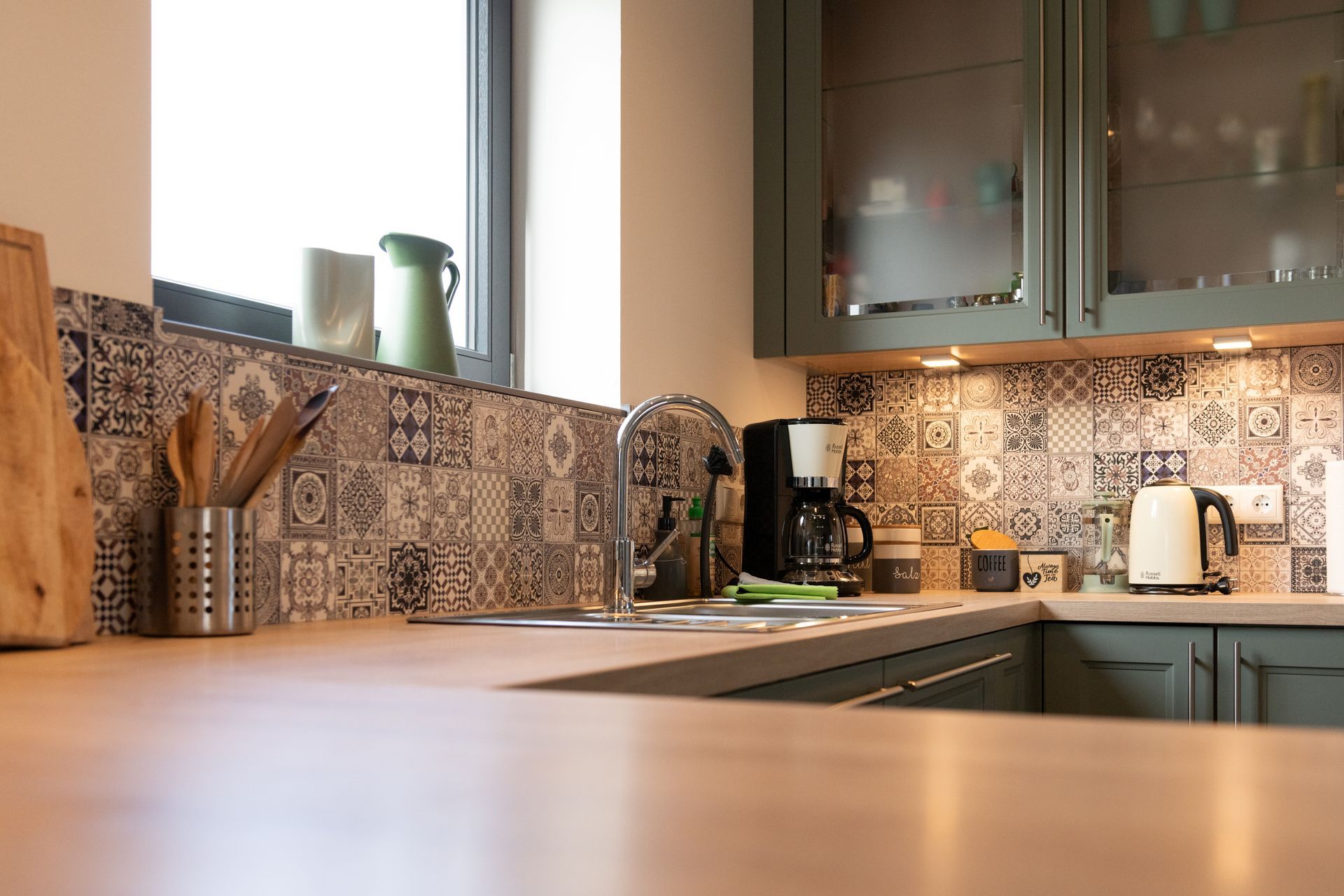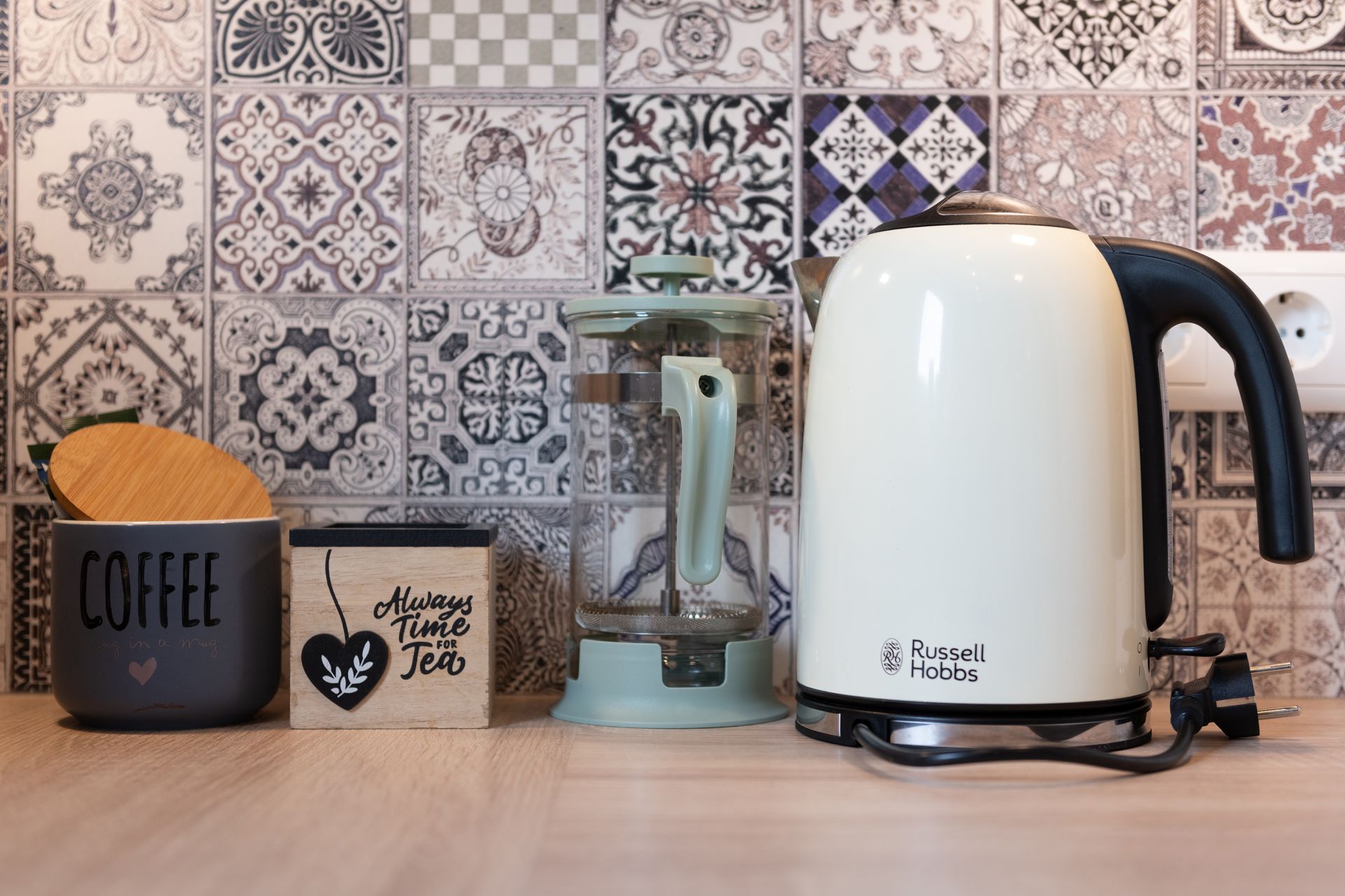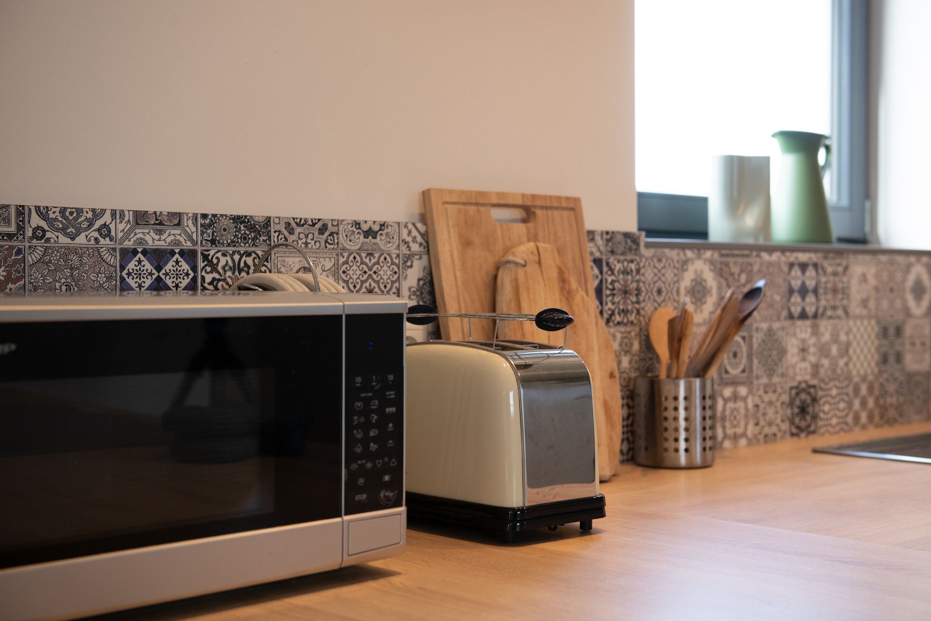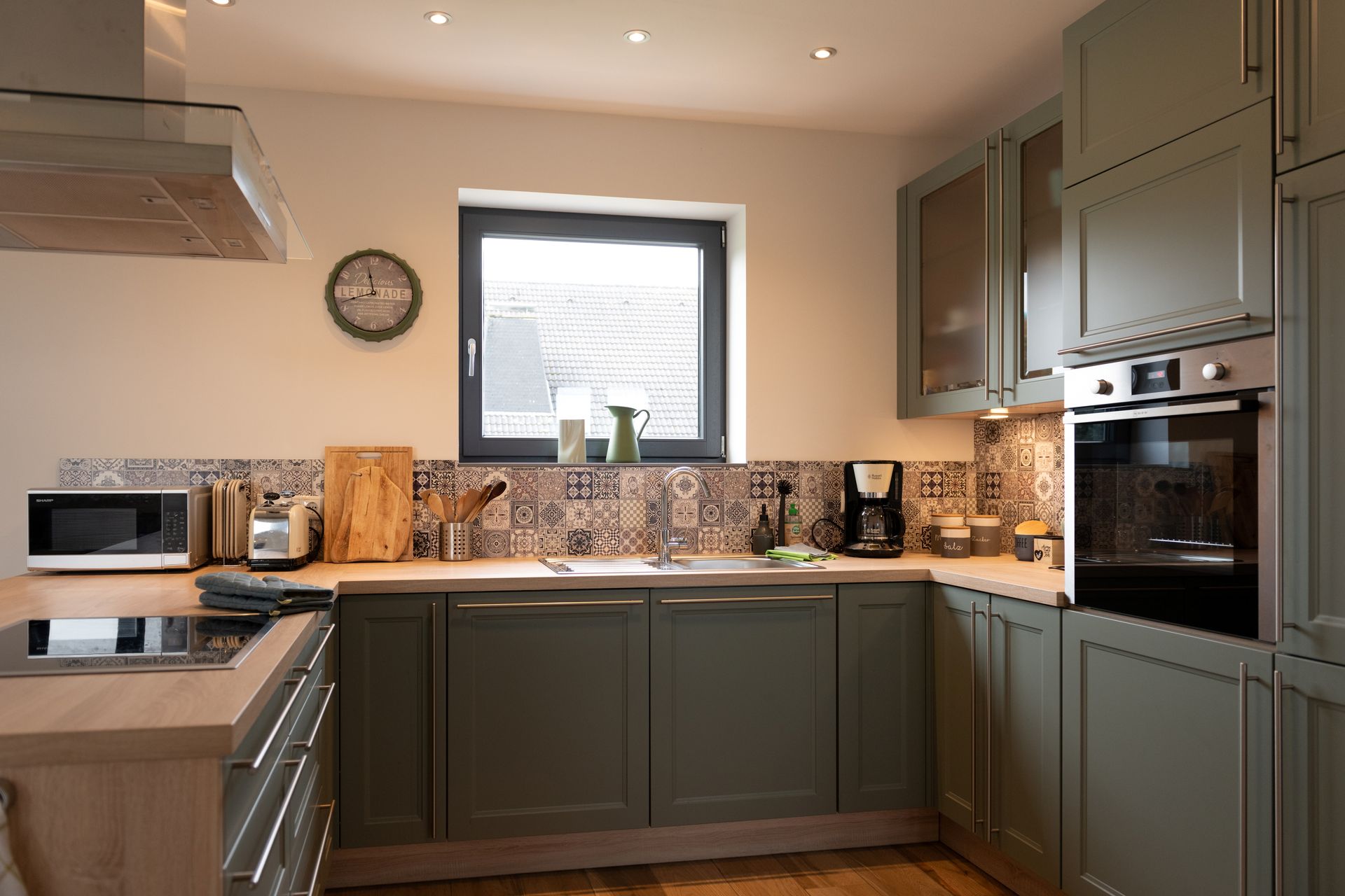 Küche vollständig ausgestattet (Toaster, Filter-Kaffeemaschine, Microwelle, Spülmaschine, Herd und Backofen, Wasserkocher, etc.)