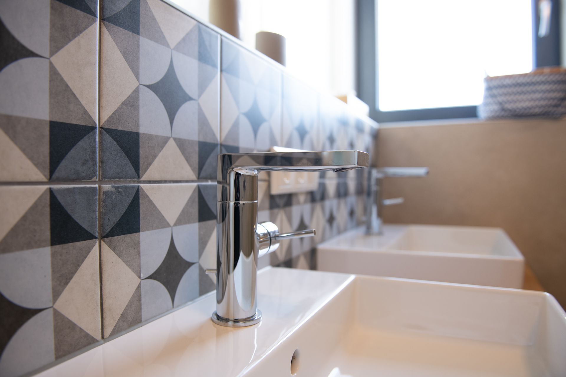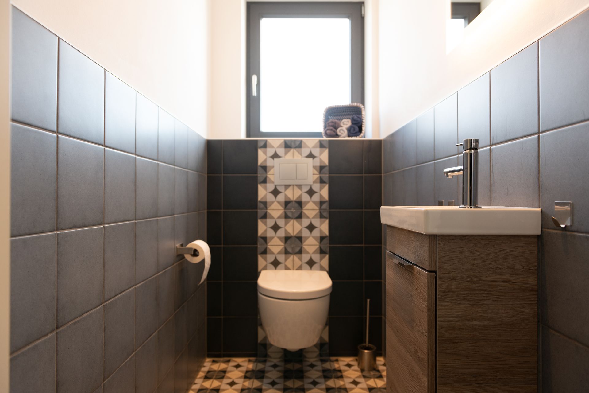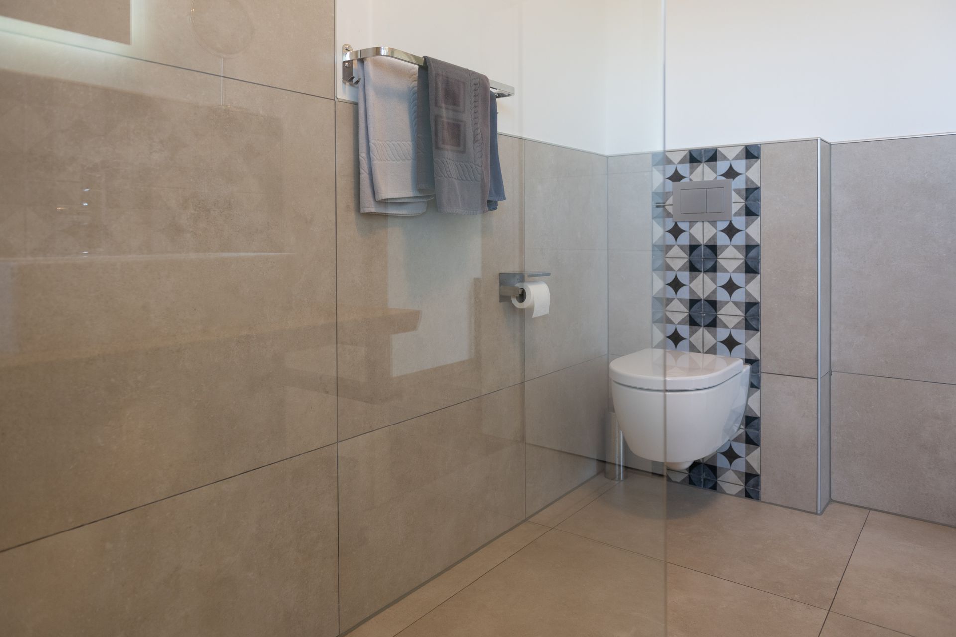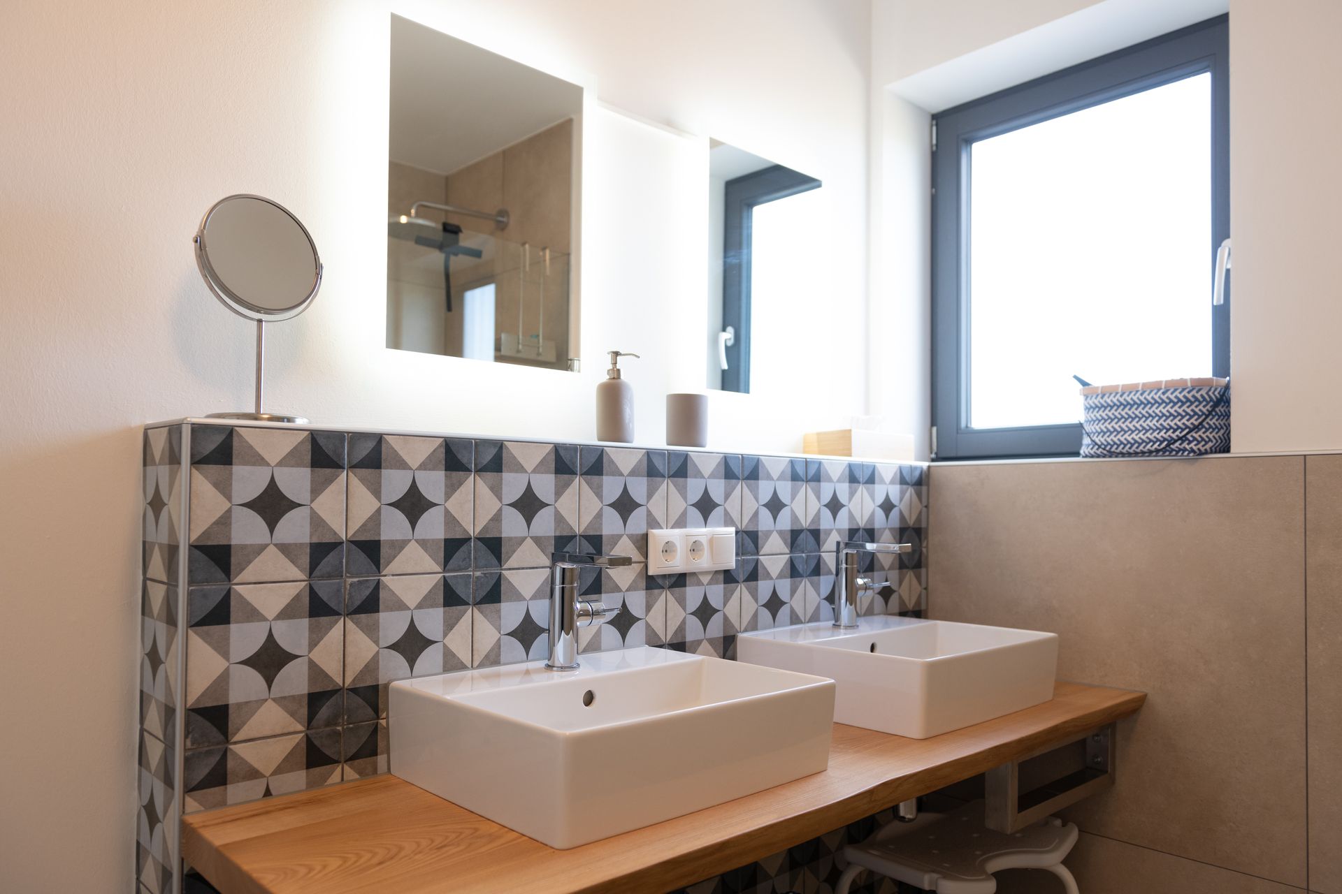Bad mit ebenerdiger Dusche und 2 Waschbecken, Gäste-WC
